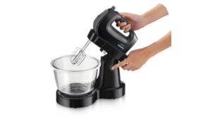 La función FlexiMix permite que las varillas batidoras se muevan hacia adentro y hacia afuera durante su uso, lo que permite actuar fácilmente incluso en la masa más dura.