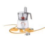 Los accesorios aptos para el lavavajillas incluyen un amasador para mezclar masas y pastas; una cuchilla para picar de acero inoxidable para carne y verdura; varios discos para rallar y cortar en tiras; una batidora resistente a los golpes de 1 l para batir, triturar y remover distintos ingredientes; y un disco emulsificador para preparar alimentos como nata montada y mayonesa.